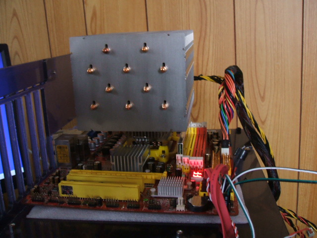 この写真は製作途中ではありません。完成形です。通気性、メンテナンスの容易さを追求した結果、究極の形がこれ。マザボを覆い隠すケースという物は存在しません。オロチの名はこの超強大なCPUクーラーの名からとりました。写真中央に鎮座し10本のヒートパイプが突き刺さっている構造物がオロチです。オロチを漢字で書くと大蛇で10本のパイプを蛇にたとえたイメージです。とにかくデカイ。最初見たとき何じゃこれって思いました。現在巷で出回っているCPUクーラーの中で最大級の大きさだと思います。こんなバカデカイクーラー見たことありません。重さも1Kg以上あります。普通のケースでは収納不可能でしょう。
